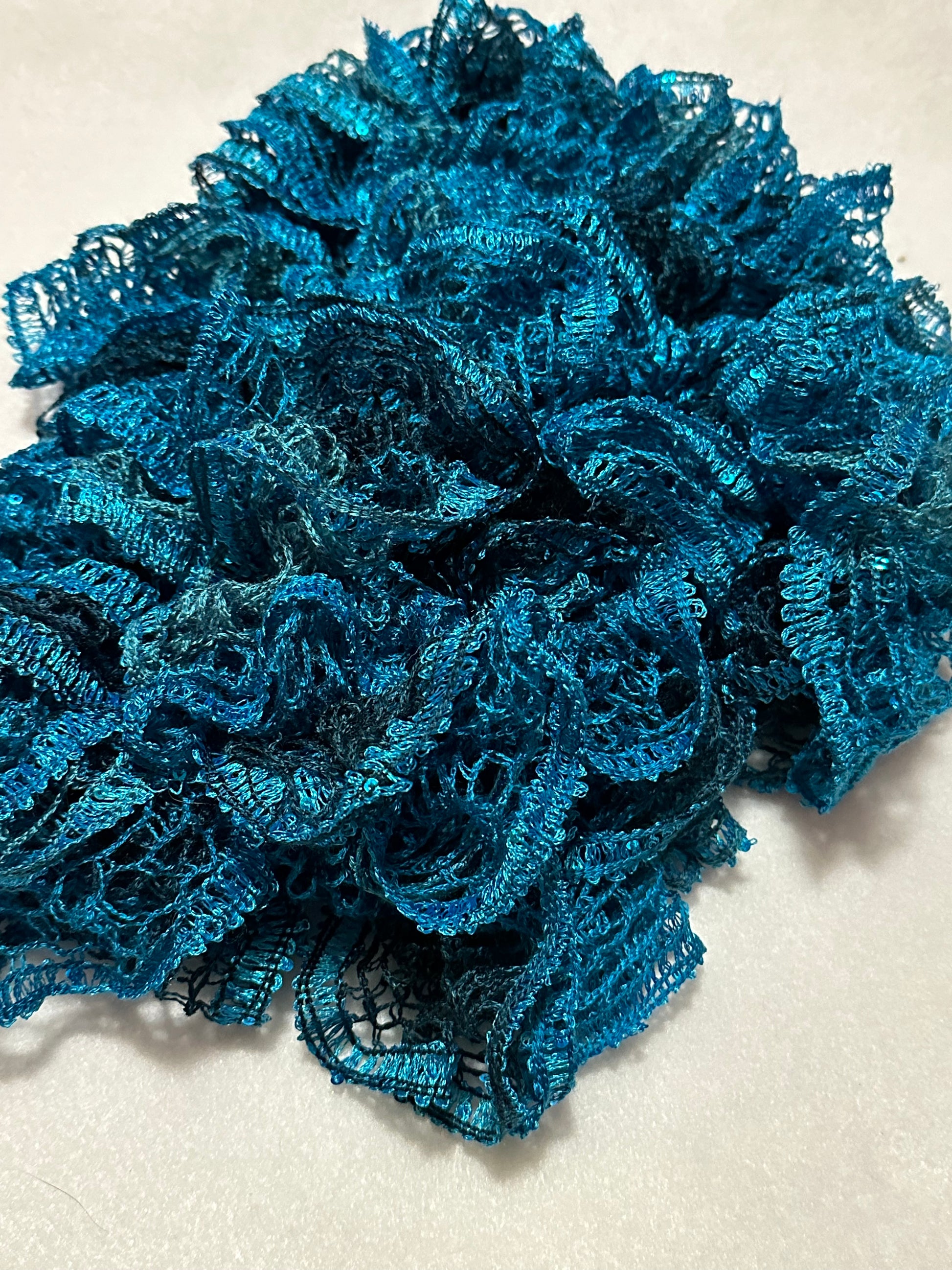 Handmade ruffled scarf, made with Red Heart Boutique Boho yarn.