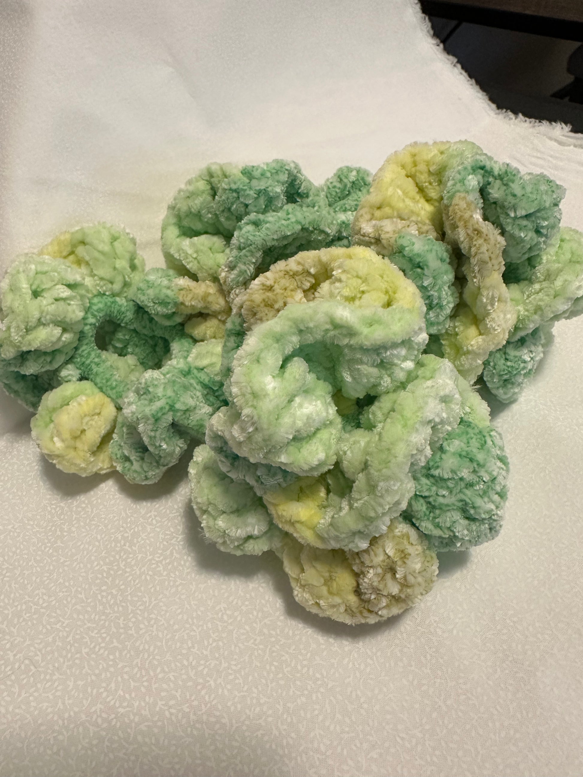 Handmade scrunchie, made with Woanger Chenille Velvet yarn